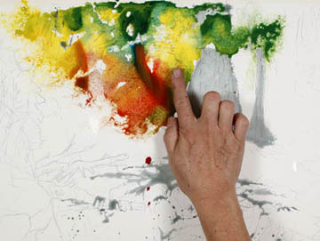Wait for masking fluid completely dry to start painting from left cliff. Use