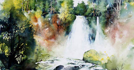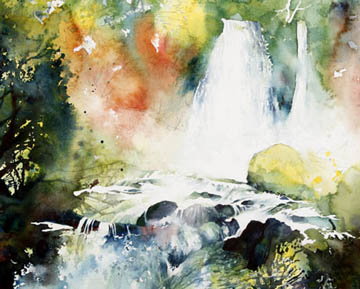 to medium Blue. Wait for whole painting dry, lift up masking on upper fall and